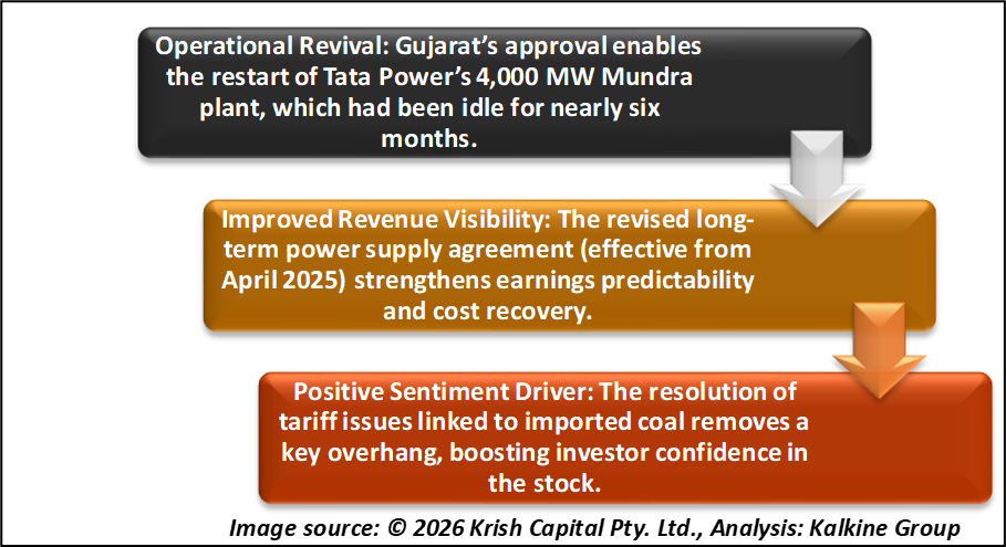 Shares of Tata Power Company (NSE:TATAPOWER)have witnessed renewed investor interest following Gujarat’s approval of a revised long-term power supply agreement for its 4,000 MW Mundra coal-based plant. The plant, which had remained idle for nearly six months due to tariff disputes linked to expensive imported coal, is now set to resume operations pending regulatory clearance.