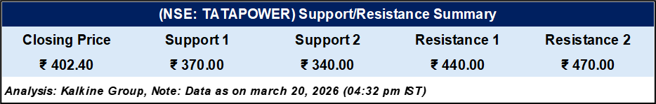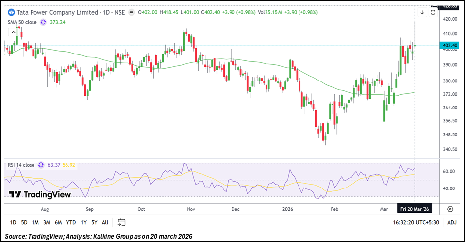 Tata Power Company Limited (NSE:TATAPOWER) closed near ₹402.40 as of March 20, 2026, gaining nearly 0.98% in the session. The stock moved above its 50-day Simple Moving Average around ₹373.24, indicating an improvement in the broader price structure.