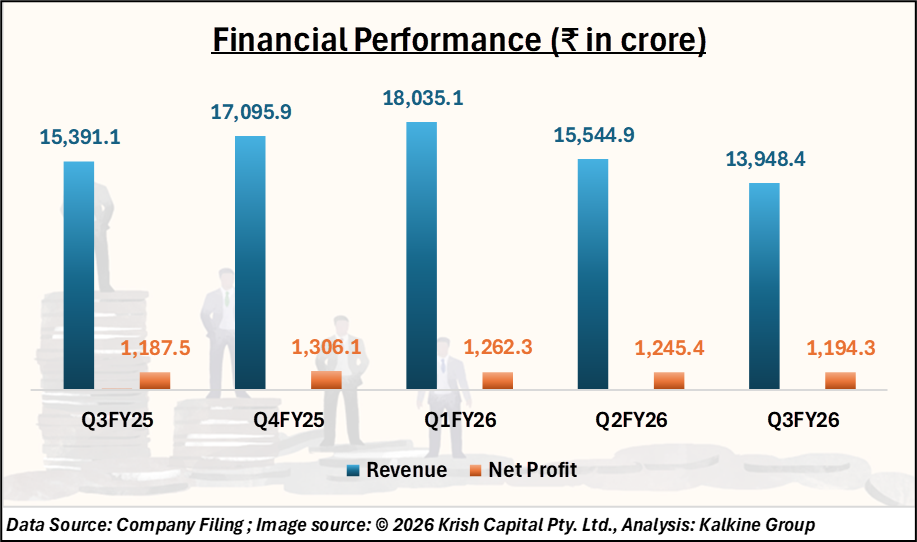 Revenue shows volatility across the last five quarters, peaking at Q1FY26 before declining to ₹13,948.4 in Q3FY26, indicating demand or execution pressure. Net profit remains relatively stable, fluctuating within a narrow range, though it trends mildly downward in recent quarters. Margins appear under pressure as revenue declines outpace profit, suggesting cost control or operating leverage challenges.