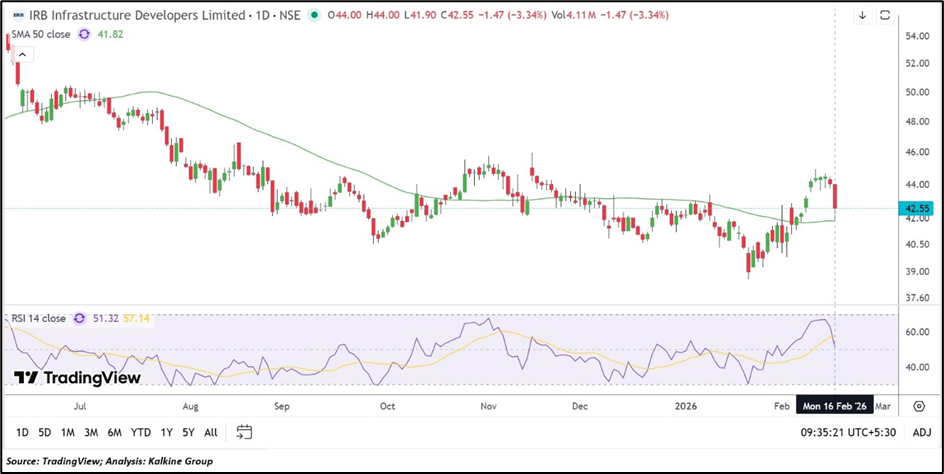 From a technical perspective, IRB Infrastructure Developers Limited is currently trading around ₹42.55, hovering close to its 50-day Simple Moving Average at ₹41.82, which is acting as immediate support. The stock recently faced resistance near the ₹46.00–₹50.00 zone, leading to intraday pressure. The broader structure remains range-bound, with immediate support seen near ₹41.80, followed by a lower cushion around ₹38.00. On the upside, resistance is positioned near ₹35.00, with a stronger hurdle around ₹46.00. The RSI near the mid-range reflects balanced momentum, keeping the near-term setup neutral within this defined band.