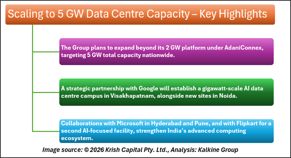 Building on the 2 GW national platform of AdaniConnex, the Group plans to expand capacity to 5 GW. A key highlight is its partnership with Google to establish a gigawatt-scale AI data centre campus in Visakhapatnam, along with additional sites in Noida. Collaboration with Microsoft covers campuses in Hyderabad and Pune. The Group is also deepening its engagement with Flipkart to build a second AI-focused facility supporting digital commerce and advanced computing needs.