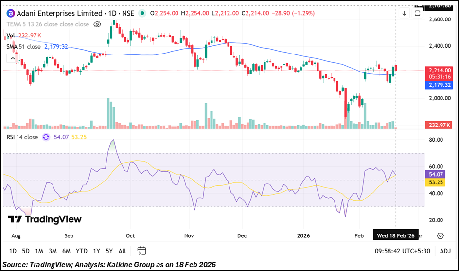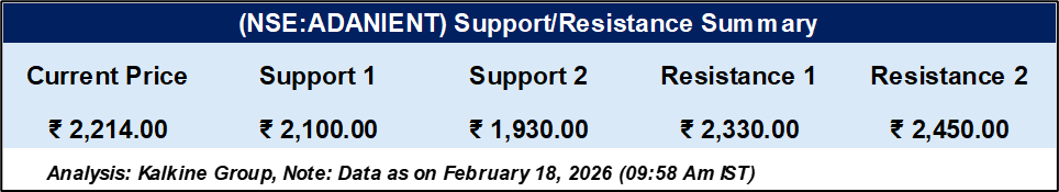 Adani Enterprises is traded at ₹2,214.00, positioned between key technical levels. Immediate support stands at ₹2,100.00, with stronger support placed at ₹1,930.00. On the higher side, resistance is marked at ₹2,330.00 and ₹2,450.00. The stock remains range-bound within these levels, and price movement near support or resistance zones may determine the next directional trend in the short term.