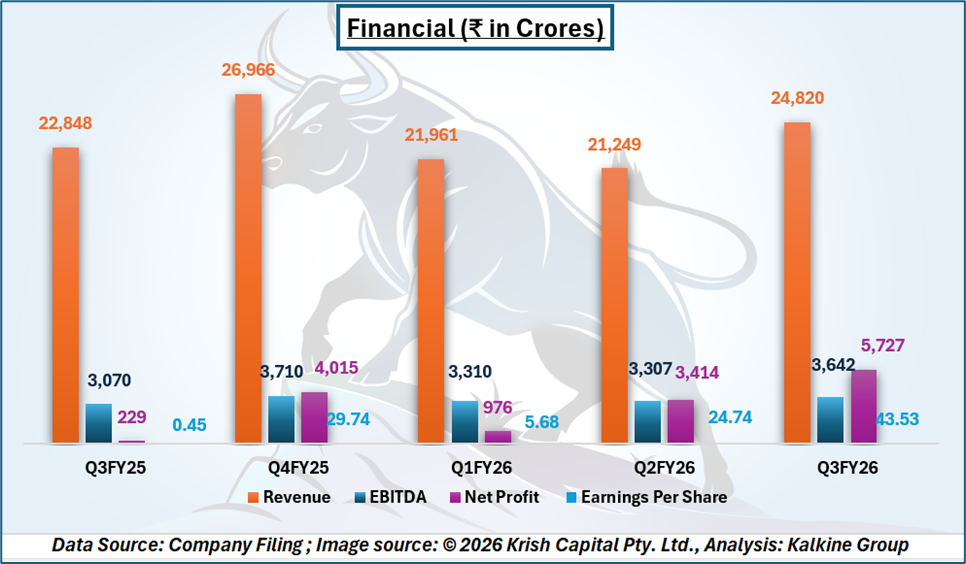 Operational performance remains strong. Revenue reached 24,820 in Q3FY26, up from 21,249 in Q2FY26. EBITDA improved to 3,642, while net profit surged to 5,727. Earnings per share climbed to 43.53, reflecting solid profitability trends alongside long-term strategic expansion.