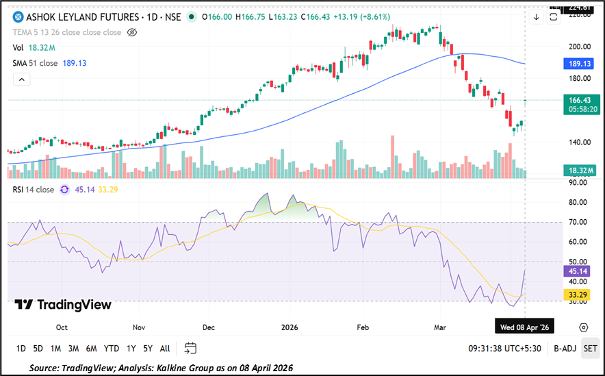 The price action in Ashok Leyland reflects a short-term bearish correction, with the stock trading at 166.43 after breaking below its 51-day SMA (189.13), which now acts as key resistance. Despite the downtrend, a strong bullish candle (+8.61%) indicates a potential relief rally and base formation near the 160-zone following a sharp fall from February highs.
