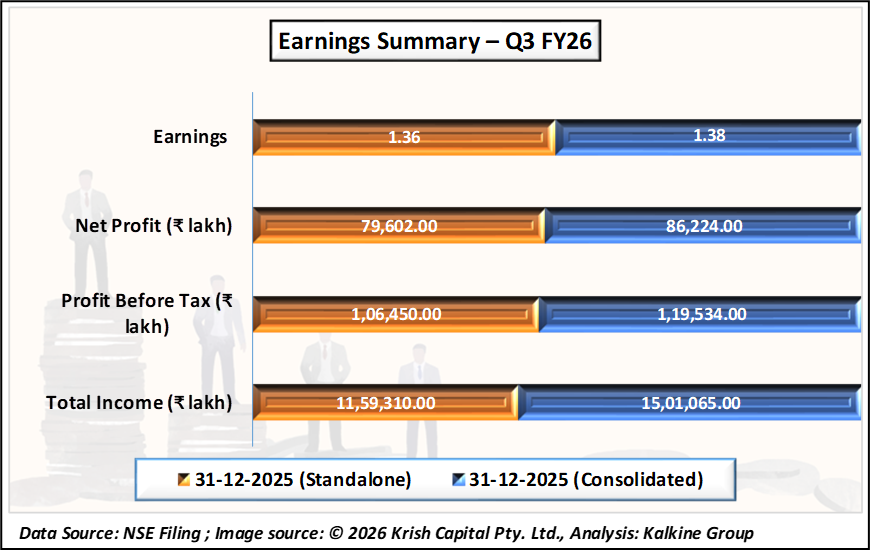 For the quarter ended December 31, 2025, the company reported a standalone total income of ₹11,59,310 lakh, with a profit before tax of ₹1,06,450 lakh and a net profit of ₹79,602 lakh. Earnings per share (EPS) for the standalone business stood at ₹1.36. On a consolidated basis, the company recorded a total income of ₹15,01,065 lakh and a net profit of ₹86,224 lakh, with EPS at ₹1.38.