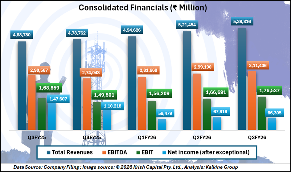 Bharti Airtel Limited delivered an impressive financial performance in Q3 FY26, highlighting the strength of its diversified business model and disciplined execution. For the quarter ended December 31, 2025, consolidated revenues rose 19.6% year-on-year to ₹53,982 crore, supported by steady growth in India and an outstanding showing in Africa. Sequential revenue growth stood at 3.5%.