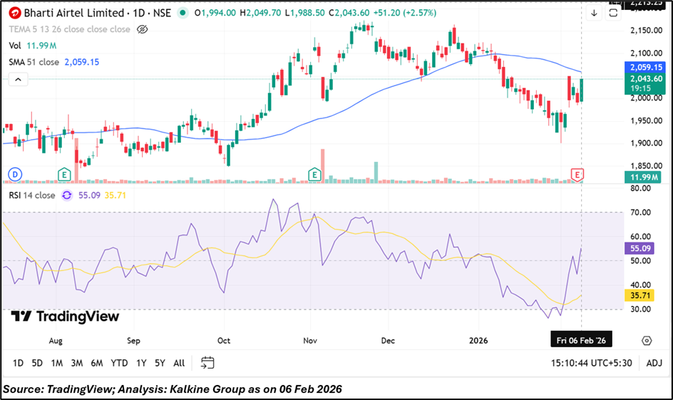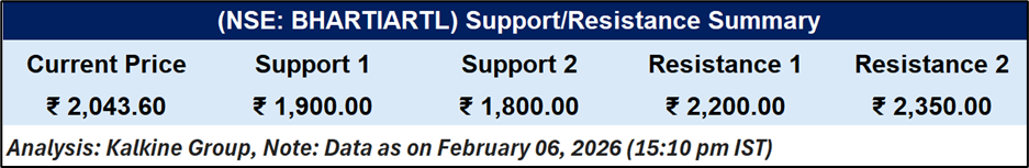Bharti Airtel traded at ₹2,043.60, with the price remaining above the key support levels identified on the chart. The first support is placed near ₹1,900, followed by the next support around ₹1,800, which marks a lower reference level during pullbacks.