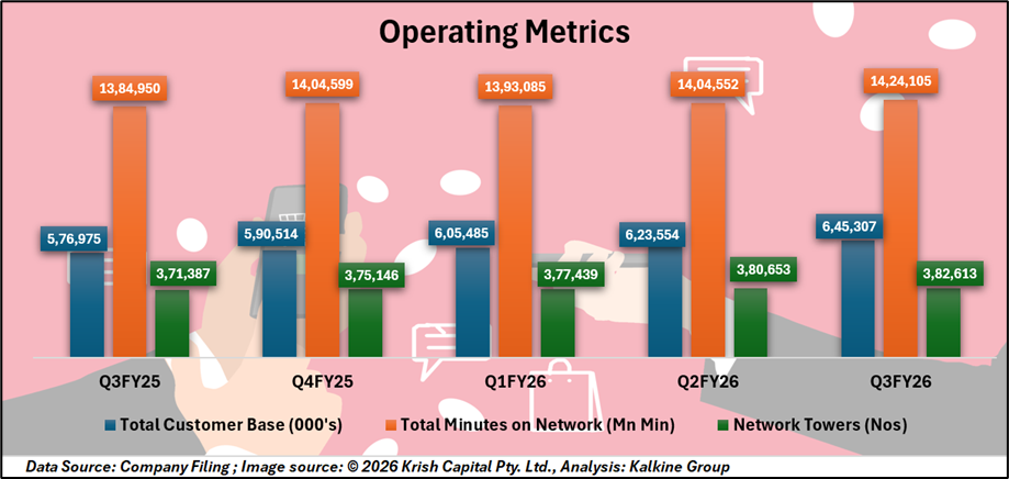 Bharti Airtel’s operating metrics show consistent expansion over the past five quarters, reflecting sustained network scale-up and rising customer engagement. The total customer base increased steadily from 576.9 million in Q3 FY25 to 645.3 million in Q3 FY26, highlighting continued subscriber additions across segments.