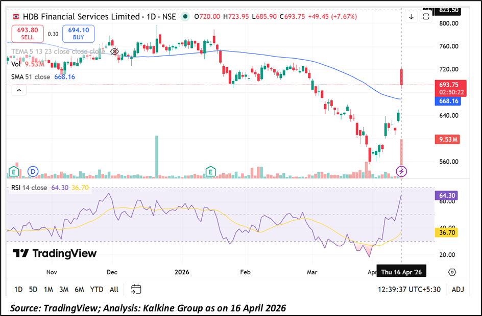 HDB Financial Services is trading at ₹693.75, up sharply by around 7.67%, and has moved back above the 51-day SMA positioned near ₹668.16, indicating a potential shift in short-term trend from bearish to recovery mode.