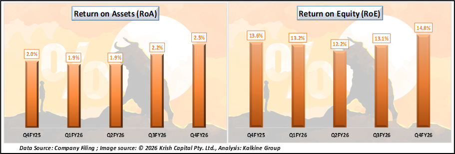 HDB Financial Services maintained healthy profitability ratios during the quarter. The Return on Assets (RoA) stood at 2.48%, while the Return on Equity (RoE) was 14.8%, reflecting efficient use of assets and shareholder capital.