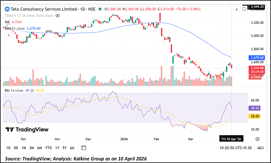 Tata Consultancy Services Limited is trading near ₹2,514, down about 2.9%, and remains below its 50-day SMA (~₹2,670), which is acting as key resistance. The stock is in a bearish phase after a sharp February correction, though recent price action hints at a technical bounce.