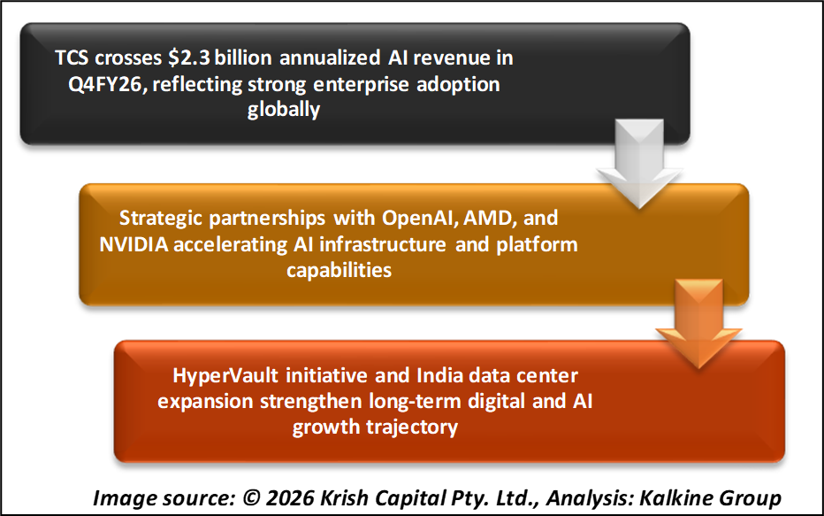 TCS is aggressively strengthening its position in artificial intelligence and digital infrastructure. The company’s annualized AI revenue crossed $2.3 billion in Q4FY26, highlighting rapid enterprise adoption of AI-led solutions.