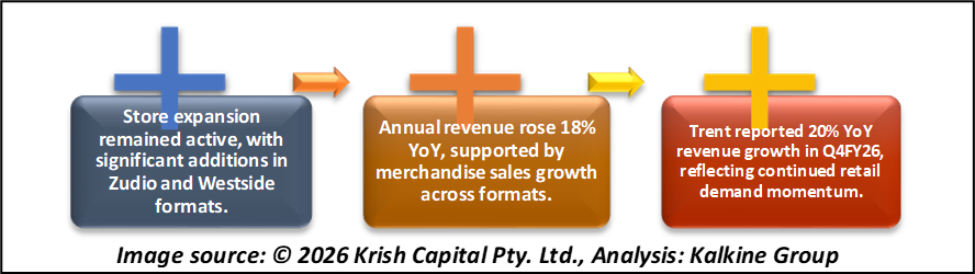 Trent Ltd (NSE:TRENT) reported standalone revenue from operations of Rs. 4,937 Cr in Q4FY26, compared to Rs. 4,106 Cr in Q4FY25, marking a 20% year-on-year increase. The growth was primarily driven by merchandise sales, which grew 21% during the quarter, excluding other operating income.