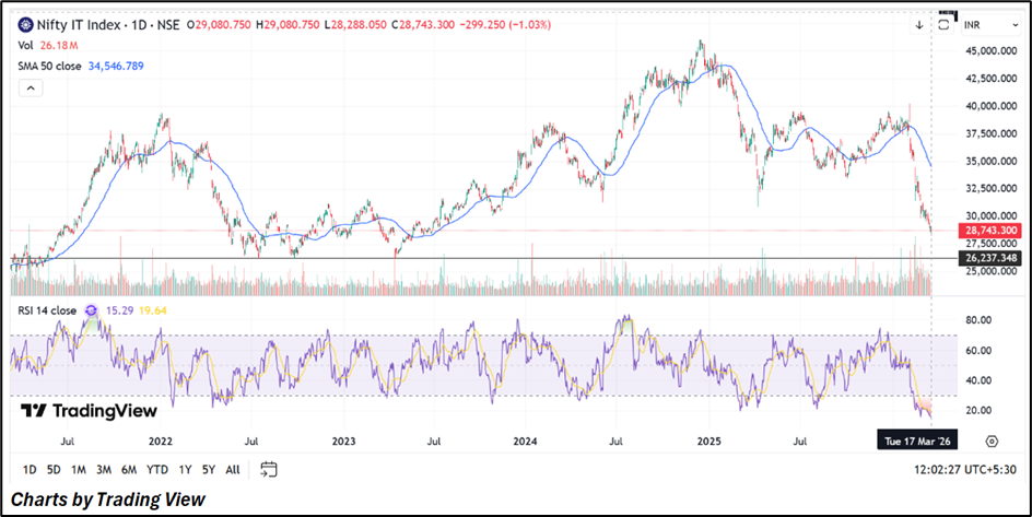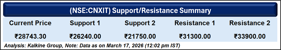 The Nifty IT index is undergoing a pronounced correction driven by global demand slowdown, macroeconomic pressures, and a structural reset in growth expectations. While technical indicators reflect continued weakness, oversold conditions may offer short-term relief. However, a sustained recovery will depend on revival in global tech spending and the index reclaiming key resistance levels, signaling a shift in sentiment.