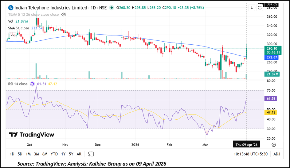 ITI Limited (NSE:ITI) shares witnessed notable upward movement on April 9, 2026, rising 8.76% to ₹290.10 compared to the previous close of ₹266.75. The stock opened at ₹268.30 and touched an intraday high of ₹298.85, indicating trading momentum during the session. The day’s low was recorded at ₹265.20.