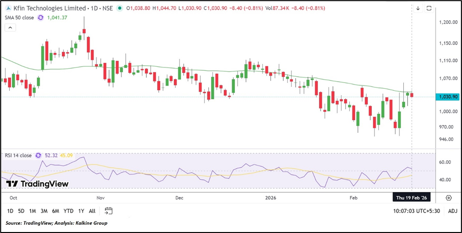 From a technical perspective, KFin Technologies is currently trading at ₹1,030.90, marginally below its 50-day SMA of ₹1,041.37, indicating a cautious near-term structure. The price action reflects a phase of consolidation after a prolonged decline from higher levels. The 14-day RSI stands at 52.32, suggesting balanced momentum without overstretched conditions. Immediate support is positioned around ₹950.00, followed by a stronger base near ₹870.00. On the upside, resistance is seen at ₹1,150.00, while a sustained move above ₹1,310.00 would be required to improve the broader technical setup.