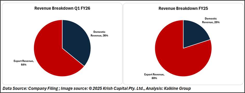 On an annual trend basis, the company’s profitability has remained resilient, supported by strong order inflows, an expanding export mix, and improved capacity utilization. Export revenues have grown sharply, constituting 80% of total revenue in Q1 FY26, compared to 64% in FY25, underscoring MTAR’s increasing global relevance.