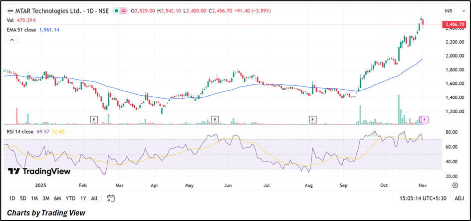 MTAR Technologies maintains bullish momentum, trading well above its 51-day EMA (₹1,961). Rising volumes confirm trend continuation. RSI at 69.57 indicates overbought territory, hinting at a possible short-term pause or mild correction. Key support is seen near ₹2,300–₹2,350, with resistance around ₹2,600.