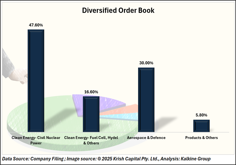 MTAR reported a diversified order book of ₹930.21 crore, underpinned by multiple high-growth verticals. Clean Energy – Civil Nuclear Power remains the largest contributor at 47.6%, followed by Aerospace & Defence (30%), Fuel Cell and Hydel Projects (16.6%), and Products & Others (5.8%). The company secured ₹105.3 crore in fresh orders during Q1 FY26, indicating steady demand across its business segments.