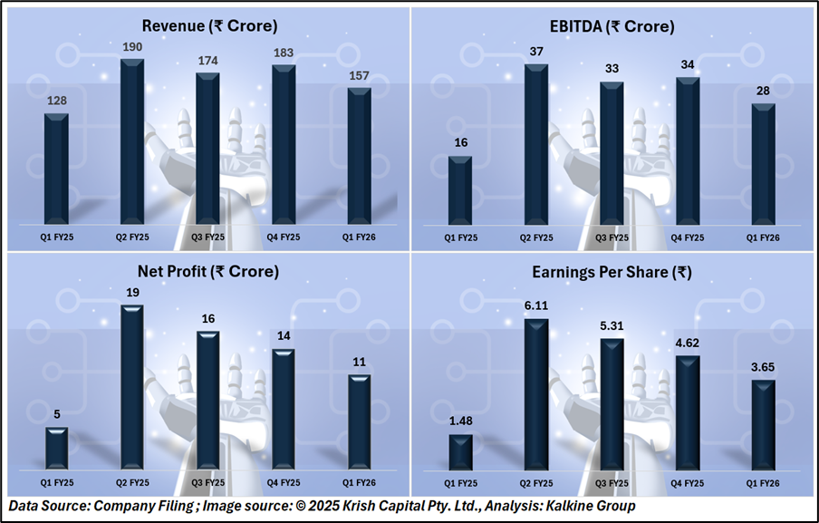 For the quarter ended June 2025, revenue stood at ₹157 crore, with EBITDA of ₹28 crore and an EBITDA margin of 18%. Net profit came in at ₹11 crore, translating to an EPS of ₹3.65. Despite industry-wide cost pressures, MTAR has maintained disciplined expense management total costs at ₹128 crore in Q1 FY26 versus ₹149 crore in March 2025 signaling improved operational efficiency.