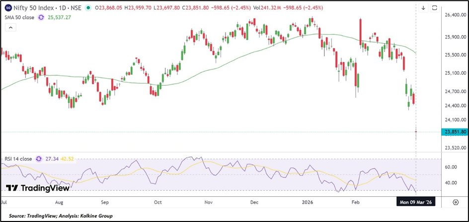From a technical perspective, The Nifty 50 Index is currently trading around 23,851.80, below the key 24,000.00 level, extending its recent downward momentum and remaining below its 50-day Simple Moving Average near 25,537.27, which now acts as a key technical reference level. The recent price structure reflects sustained selling pressure following the market's failure to hold higher levels earlier in the year. Meanwhile, the 14-day RSI is near 27.34, indicating oversold conditions and weak short-term momentum. On the downside, the 22,800.00–21,700.00 range could act as an immediate cushion if selling persists. However, if the index attempts a recovery, the 24,800.00–25,800.00 zone may emerge as a near-term hurdle for the benchmark.