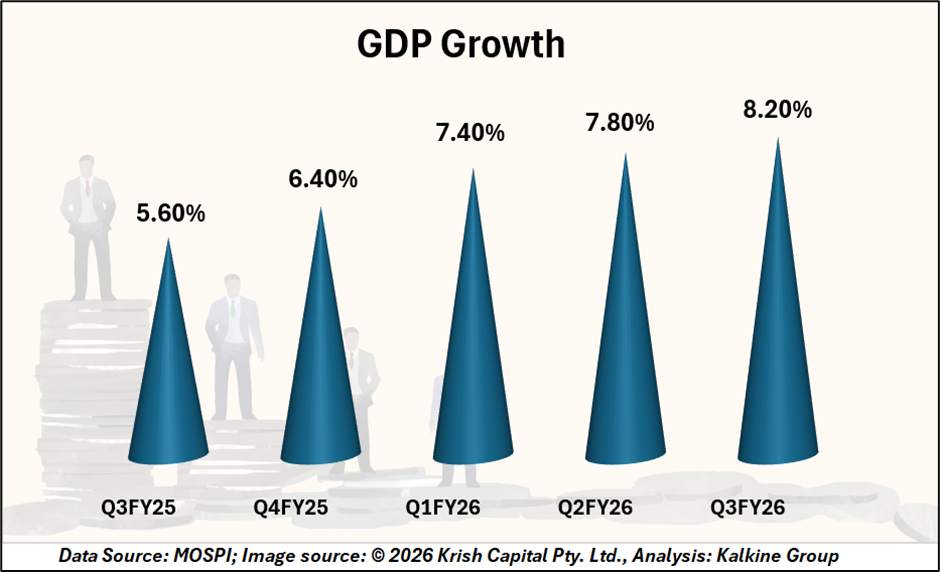 According to the First Advance Estimates, real GDP growth for FY26 is projected at 7.4%, supported by private consumption and fixed investment. Services sector output and manufacturing activity contributed to the supply-side expansion, while net exports remained a drag due to higher imports.