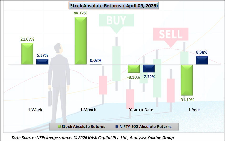 The stock has significantly outperformed broader indices in recent sessions. Over the past week, it delivered returns of 21.67% compared to 5.37% in the NIFTY 500. On a one-month basis, the stock gained 48.17%, while the index remained largely flat.