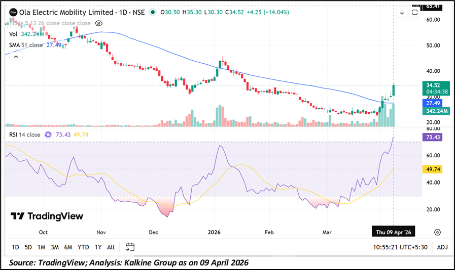 Ola Electric Mobility (NSE:OLAELEC) shares rose 14.04% to ₹34.52 on April 9, 2026, placing the stock among the top gainers of the session. The stock opened at ₹30.50 and moved within a wide intraday range of ₹30.30 to ₹35.30, indicating elevated volatility.