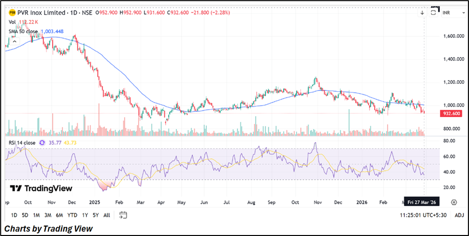 PVR INOX Ltd (NSE:PVRINOX) is exhibiting a weak technical structure, with price trading below the 50-day moving average near INR 1,003, indicating sustained bearish momentum. The stock has been forming lower highs and lower lows, reflecting continued selling pressure. RSI is positioned near 36, remaining below the neutral zone and signalling subdued momentum. Price action around INR 930 suggests cautious sentiment, with consolidation bias likely unless sustained buying interest emerges above moving average levels.