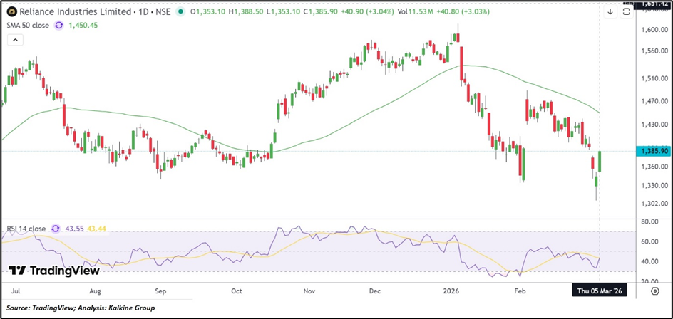 Technical Perspective: Reliance Industries Limited (NSE: RIL) is currently trading near ₹1,385.90, remaining below its 50-day Simple Moving Average around ₹1,450.45, which is acting as an immediate technical reference level. The recent price structure reflects a partial recovery following a corrective phase, with the stock currently moving within a consolidation range. The 14-day RSI near 43.55 indicates moderate momentum conditions without a clear directional tilt. On the downside, the ₹1,300.00–₹1,200.00 zone may serve as an important support range. Meanwhile, on the upside, the ₹1,700.00–₹1,800.00 band may act as a potential resistance area in the near term.