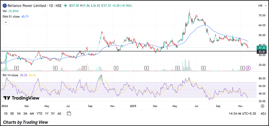 Reliance Power trades near key support at ₹34, with sustained weakness below the 50-day EMA. Momentum is bearish as RSI stays near oversold levels. Price remains in a declining trend, and a break below ₹33 may trigger further downside, while holding above this zone could prompt a short-term bounce.