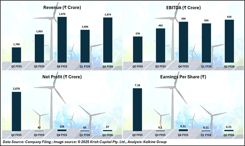 In Q2 FY26, Reliance Power reported revenue of ₹1,974 crore, marking a 12.2% growth compared to Q2 FY25 and a sequential rise from ₹1,886 crore in Q1 FY26. The company managed expenses at ₹1,356 crore, supporting an EBITDA of ₹618 crore with a margin of 31%, reflecting sustained operational efficiency. Net profit for the quarter stood at ₹87 crore, a sequential improvement from ₹45 crore in Q1 FY26, translating into an EPS of ₹0.21.