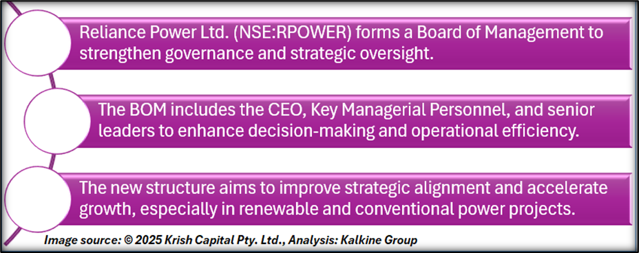 Reliance Power Ltd. (NSE:RPOWER) has approved the formation of a Board of Management (BOM) aimed at strengthening governance and strategic oversight. The new BOM will comprise the CEO, Key Managerial Personnel, and senior business leaders, reflecting the company’s commitment to enhanced decision-making, operational efficiency, and long-term value creation.