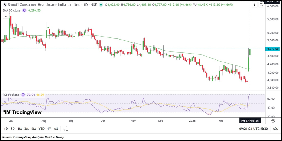 Sanofi Consumer Healthcare India Limited (NSE: SANOFICONR) rose 4.66% to ₹4,777.00 on 27 February 2026, extending its recent upward trajectory following encouraging quarterly performance. The company operates in the consumer healthcare space, offering vitamins, nutritional supplements, and over-the-counter wellness products across India. Steady demand across core brands, improving scale efficiencies, and disciplined cost management supported revenue growth during the period. Strong return ratios and healthy cash generation underscore operational stability. Although margin pressure from higher input costs remains a monitorable factor, diversified product offerings and sustained domestic consumption trends continue to provide structural support to overall performance.