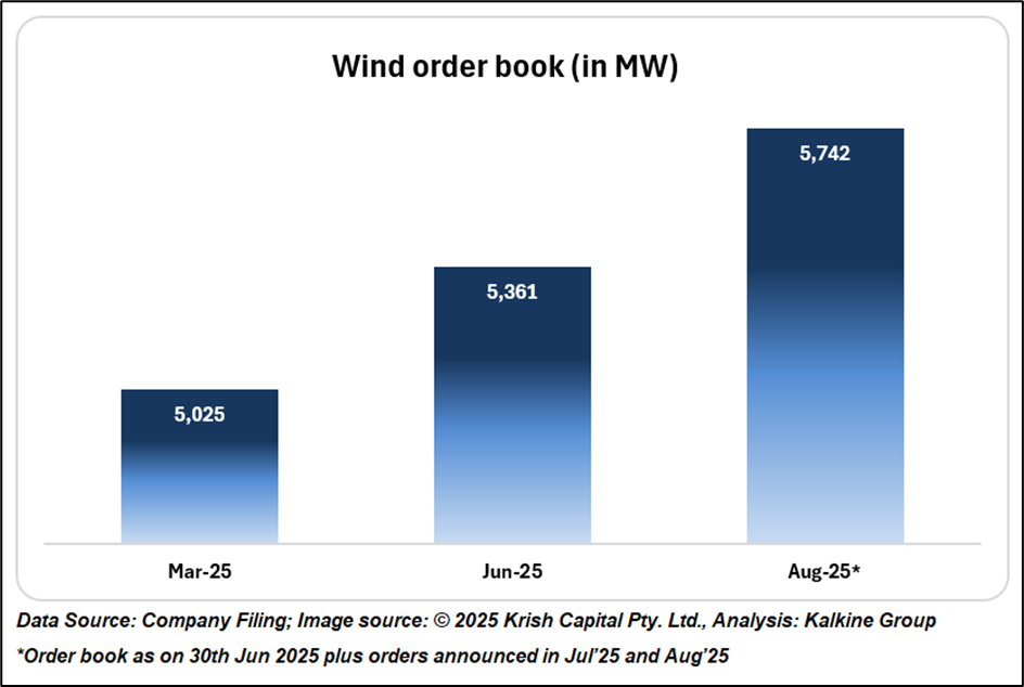 EBITDA rose sharply to ₹599 crore in Q1FY26, representing a 62% YoY increase with margins expanding to 19.2%. Profit before tax stood at ₹459 crore, up from ₹302 crore a year earlier. Net profit came in at ₹324 crore, maintaining profitability despite higher depreciation and finance costs. The wind turbine generator (WTG) business contributed strongly, with a healthy margin of 26% supported by favorable customer and scope mix.
