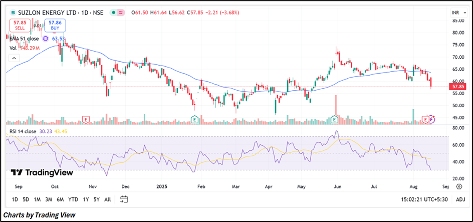 Suzlon Energy Ltd is trading at ₹57.85, down 3.68%, and currently positioned below its 51-day EMA of ₹63.53. The stock is approaching key support levels at ₹54 and ₹49.85, while resistance lies at ₹61.30 and ₹66.30. The RSI at 30.23 indicates the stock is near oversold territory, suggesting the possibility of short-term stabilization or a pullback, though broader momentum remains weak.