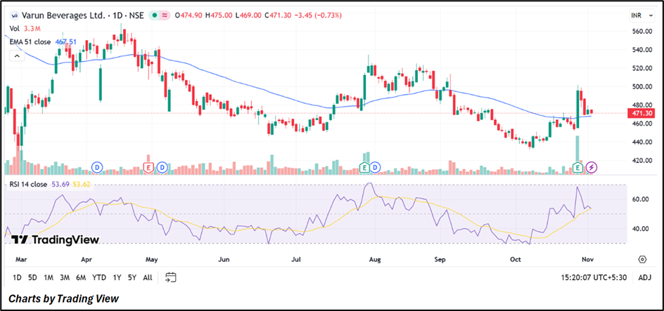 Varun Beverages Ltd. (NSE: VBL) is trading around ₹471.30, down 0.73%. The stock is hovering near the 51-day EMA at ₹467.51, indicating a potential support zone. RSI at 53.69 signals neutral momentum. Price action suggests consolidation after a recent rebound, with immediate support near ₹460 and resistance in the ₹500–₹535 range.