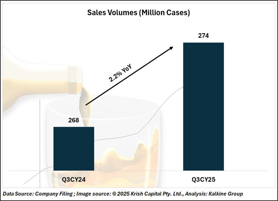 Consolidated sales volumes rose 2.4% during the quarter to 273.8 million cases, with international markets — led by South Africa — growing 9%, offsetting subdued domestic demand caused by extended monsoon conditions.