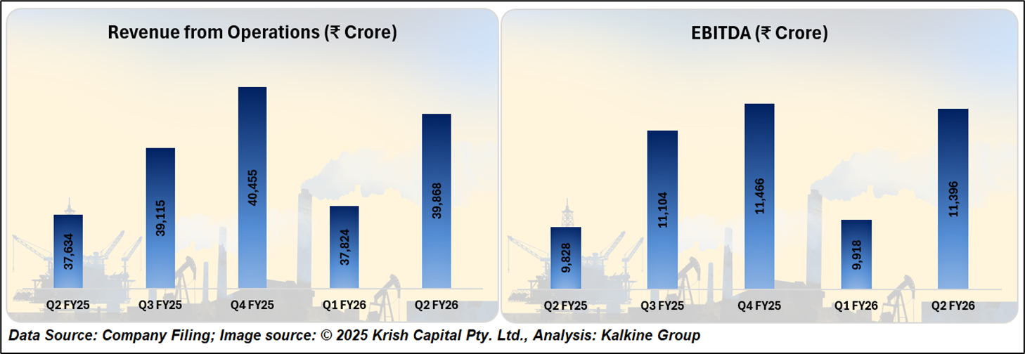 Vedanta Limited delivered a strong Q2FY26 performance, reporting record quarterly revenue of ₹39,218 crore, up 6% YoY, supported by improved commodity prices, premiums and forex gains. EBITDA rose 12% YoY to ₹11,612 crore, with margins at 34%. Profit before exceptional items increased 13% YoY to ₹5,026 crore, while net debt-to-EBITDA improved to 1.37x, reflecting disciplined capital management and deleveraging.
