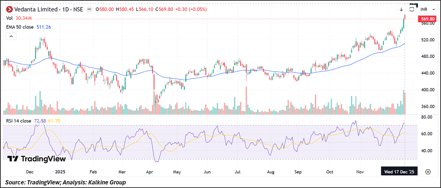 Vedanta Limited continues to trade in a well-defined uptrend, holding firmly above its 50-day EMA near 511, which reinforces the medium-term bullish structure. The breakout to a fresh all-time high reflects strong momentum supported by rising volumes. The RSI around 72 indicates elevated momentum, suggesting near-term consolidation, while support is seen near 527–485.