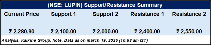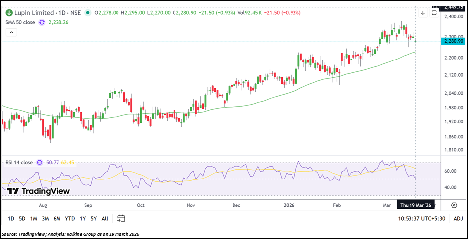 Lupin Limited is currently trading around ₹ 2,280.90, declining about 0.93% in the session, but continues to hold above its 50-day Simple Moving Average near ₹ 2,228.26, which remains an important trend indicator. The price structure reflects a steady uptrend with a pattern of higher highs and higher lows, indicating underlying strength despite recent consolidation.