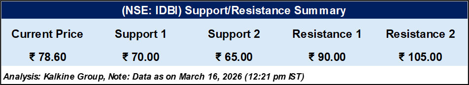 Momentum indicators also remain weak, with the 14-day RSI near 22.11, indicating deeply oversold conditions following the recent decline. Immediate support is seen around ₹ 70.00–₹ 65.00, while ₹ 90.00–₹ 105.00 may act as a resistance zone, which could influence the next directional move.