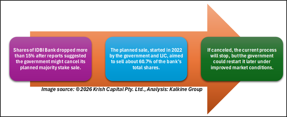 Shares of IDBI Bank fell more than 15% on Monday after reports said the Indian government might cancel its plan to sell a majority stake in the bank. The fall happened because the bids from investors were lower than the price the government wanted, which could stop the sale. The plan, started in 2022 by the government and Life Insurance Corporation of India (LIC), was to sell around 60.7% of the bank’s shares.