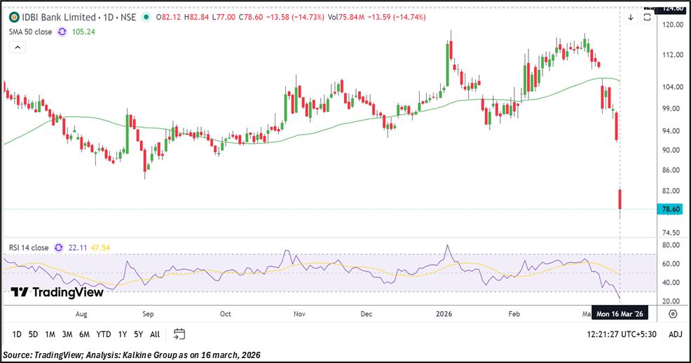 IDBI Bank Limited is currently trading around ₹ 78.60, declining about 14.74%, and remains positioned well below its 50-day Simple Moving Average near ₹ 105.24, which continues to act as an important technical reference for the broader trend. The recent price structure reflects a sharp corrective move after a prior upward phase, with the stock witnessing significant downside momentum on the daily chart.