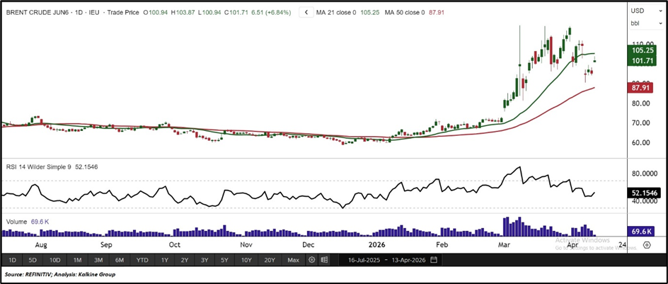 Brent crude continues to hold above the 50-day SMA near USD 87.91. The immediate support zone is seen between USD 100.00 and USD 92.00, while the next hurdle remains in the USD 115.00–125.00 range.
