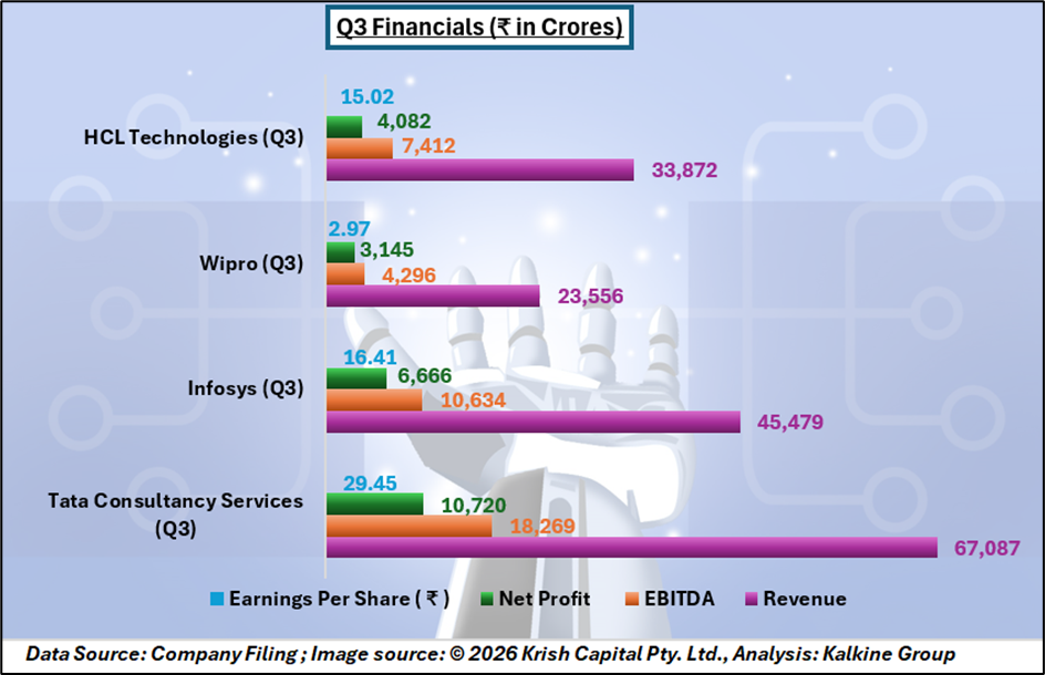 Their Q3 financials highlight strong operational capabilities. TCS reported revenue of ₹67,087 crore and net profit of ₹10,720 crore, while Infosys posted ₹45,479 crore in revenue and ₹6,666 crore in profit. Wipro and HCL Technologies also demonstrated stable earnings performance. Such financial strength positions them well to invest further in AI research, partnerships, and product innovation.