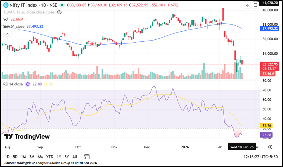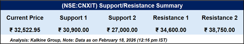 CNXIT is trading at ₹32,522.95. Immediate support is placed at ₹30,900, followed by stronger support at ₹27,000. On the upside, resistance stands at ₹34,600, with a higher barrier at ₹38,750. The index remains positioned between key support and resistance levels, indicating defined trading zones in the near term.