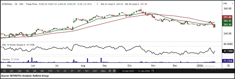 Eternal Limited, formerly Zomato Limited (NSE: ETERNAL), operates as an Internet portal that helps in connecting the users, restaurant partners or third-party merchants and the delivery partners rose by 5.16% and closed at INR283.50 before Q3 result released. The company operates across four core verticals, comprising the Zomato platform, Blinkit, District, and the Hyperpure supply business. It also provides a platform for restaurant partners and brands to advertise themselves and supply ingredients to restaurant partners.