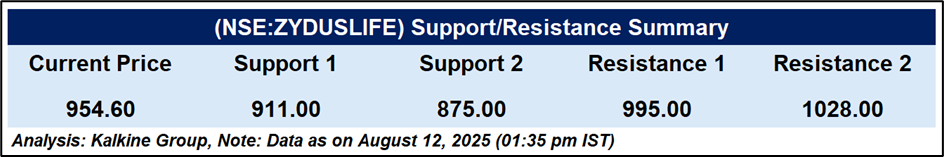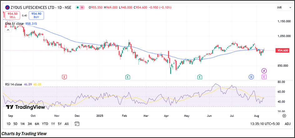 Zydus Lifesciences is currently trading at ₹954.60, marginally below its 51-day EMA of ₹958.31, indicating mild intraday weakness. The RSI stands at 46.89, suggesting neutral momentum. Immediate support is seen at ₹911 and ₹875, while resistance lies at ₹995–₹1,028. A sustained move above the 51-day EMA may improve sentiment, whereas a fall below ₹940 could invite further selling pressure.