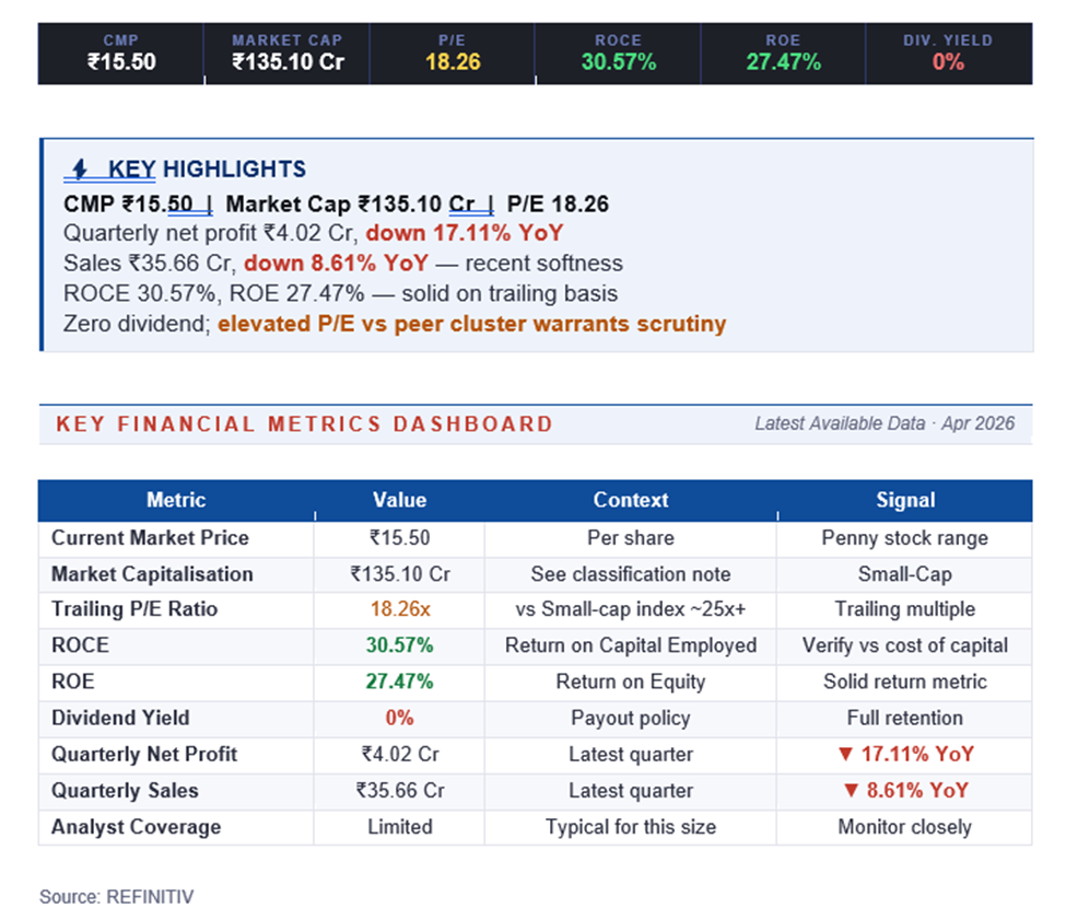 Enser is a small-cap Indian listed entity operating in the communications and technology services segment. With a market capitalisation of ₹135.10 crore and a share price of ₹15.50, Enser is larger than most nano-cap penny stocks but still firmly in small-cap territory. Indian communications and tech-services companies in this size bracket typically operate in B2B domains — providing communication infrastructure, IT services, or specialised technology solutions to enterprise and government customers.